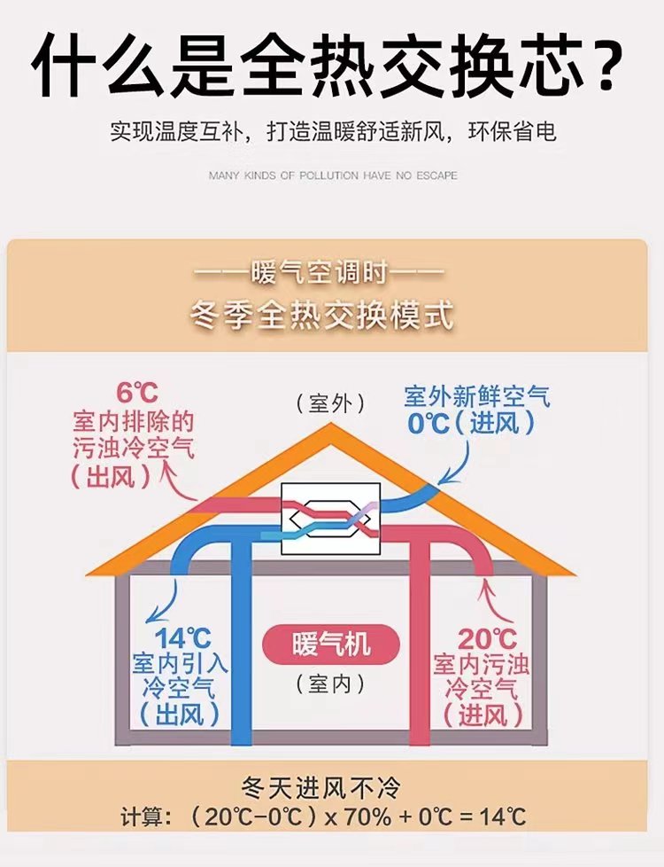 那在冬季的時(shí)候呢,還可以利用室內(nèi)暖氣的能量,對(duì)室外的冷空氣進(jìn)行預(yù)熱,再送回室內(nèi),這樣室內(nèi)的暖氣的能量損失減少,并且可以給進(jìn)入室內(nèi)的新風(fēng)加濕,因此無(wú)論是夏季還是冬季進(jìn)入室內(nèi)的新風(fēng)都可以通過(guò)全熱交換芯體,從排出去的空氣中回收能量,從而降低能耗,節(jié)約能源,達(dá)到健康舒適環(huán)保的目的,另外全熱交換效率越高,交換時(shí)損失的能量也就越少,也會(huì)更加的節(jié)能。